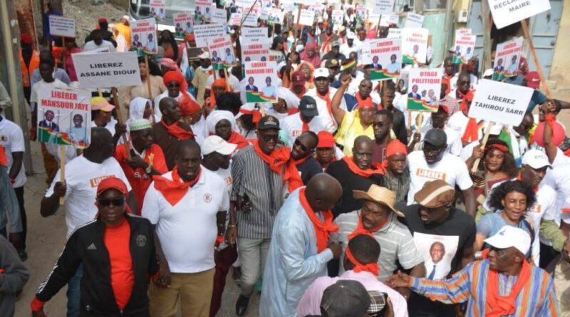 Pancartes en main, les manifestants ont dénoncé des « arrestations arbitraires » et « répression ciblant les responsables de l’Apr ». Des responsables politiques comme l’ancien président de l’Assemblée nationale Amadou Mame Diop, Pape Malick Ndour, Aminata Gueye, Abdoulaye Saydou Sow, Mor Ngom ou encore Augustin Tine maire de la commune de Fandène ont pris part à la marche pacifique. Prenant la parole, ce dernier a dénoncé « des considérations politiques » qui selon lui ont motivé l’arrestation de Mansour Faye. Il s’insurge contre des « calculs » et annonce qu’ils vont maintenir la mobilisation jusqu’à la libération de leurs camarades arrêtés.