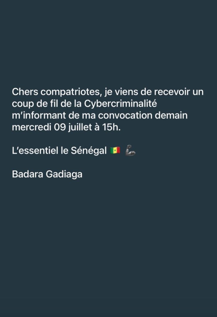 ActualitéJusticePolitiqueSport Badara Gadiaga convoqué à la cybercriminalité ce mercredi juillet 8, 2025 Faye Après Madiambal Diagne, c’est autour du chroniqueur de « Jakaarlo » de répondre aux enquêteurs de la DSC. Il est convoqué ce mercredi à 15h.Le motif de sa convocation n’a pas été notifié.