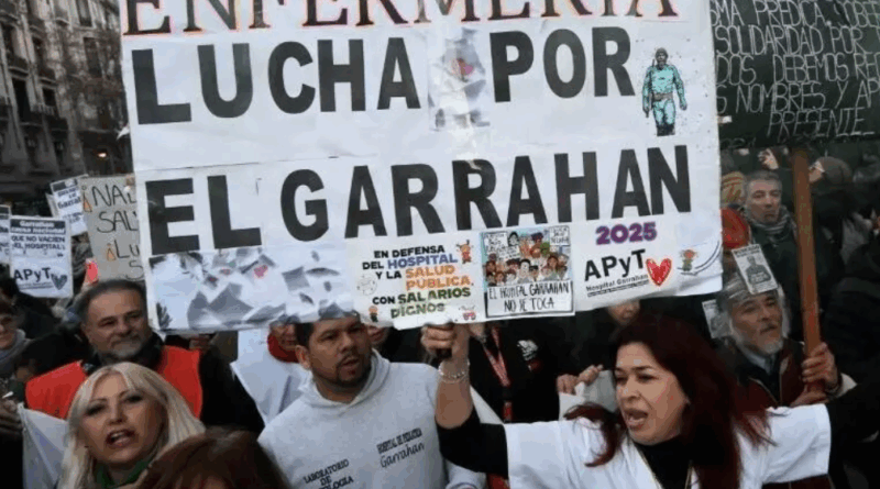 À l’écart de l’imposant cortège de blouses blanches qui défilent vers le palais présidentiel argentin, Delvia brandit timidement une pancarte : « Mon fils est tombé malade à neuf ans, il a été admis au Garrahan dans un moment critique et ils lui ont diagnostiqué la maladie de Crohn, c’est le seul hôpital où il peut être traité…. Et c’est un interne qui a découvert la maladie… Alors, je viens défendre l’hôpital ».