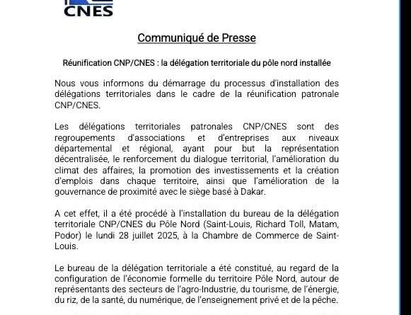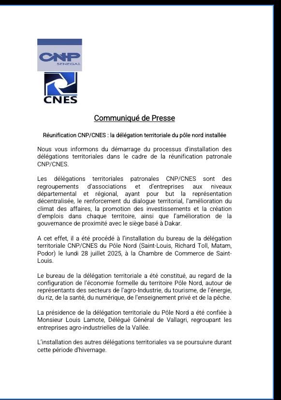 Nous vous informons du démarrage du processus d’installation des délégations territoriales dans le cadre de la réunification patronale CNP/CNES.Les délégations territoriales patronales CNP/CNES sont des regroupements d’associations et d’entreprises aux niveaux départemental et régional, ayant pour but la représentation décentralisée, le renforcement du dialogue territorial, l’amélioration du climat des affaires, la promotion des investissements et la création d’emplois dans chaque territoire, ainsi que l’amélioration de la gouvernance de proximité avec le siège basé à Dakar.A cet effet, il a été procédé à l’installation du bureau de la délégation territoriale CNP/CNES du Pôle Nord (Saint-Louis, Richard Toll, Matam, Podor) le lundi 28 juillet 2025, à la Chambre de Commerce de Saint-Louis.Le bureau de la délégation territoriale a été constitué, au regard de la configuration de l’économie formelle du territoire Pôle Nord, autour de représentants des secteurs de l’agro-Industrie, du tourisme, de l’énergie, du riz, de la santé, du numérique, de l’enseignement privé et de la pêche.La présidence de la délégation territoriale du Pôle Nord a été confiée à Monsieur Louis Lamote, Délégué Général de Vallagri, regroupant les entreprises agro-industrielles de la Vallée.L’installation des autres délégations territoriales va se poursuivre durant cette période d’hivernage.