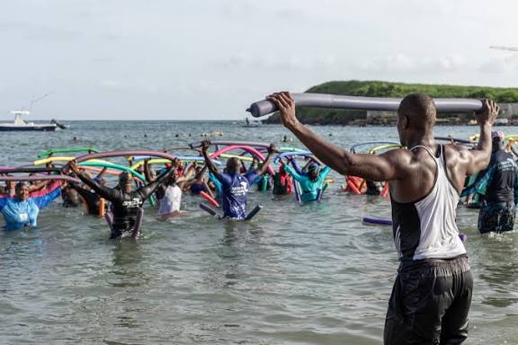 Sous un soleil de plomb, la mer de Rufisque accueille chaque week-end des dizaines de pratiquants, femmes et hommes, jeunes et moins jeunes. Encadrés par 17 moniteurs – dont sept femmes – ils enchaînent les marches dans l’eau, battements de jambes, flexions et exercices de biceps, dans une ambiance à la fois sportive et conviviale. L’aquagym, mélange d’exercices cardiovasculaires et musculaires, sollicite chaque partie du corps. Et ses effets thérapeutiques sont spectaculaires.