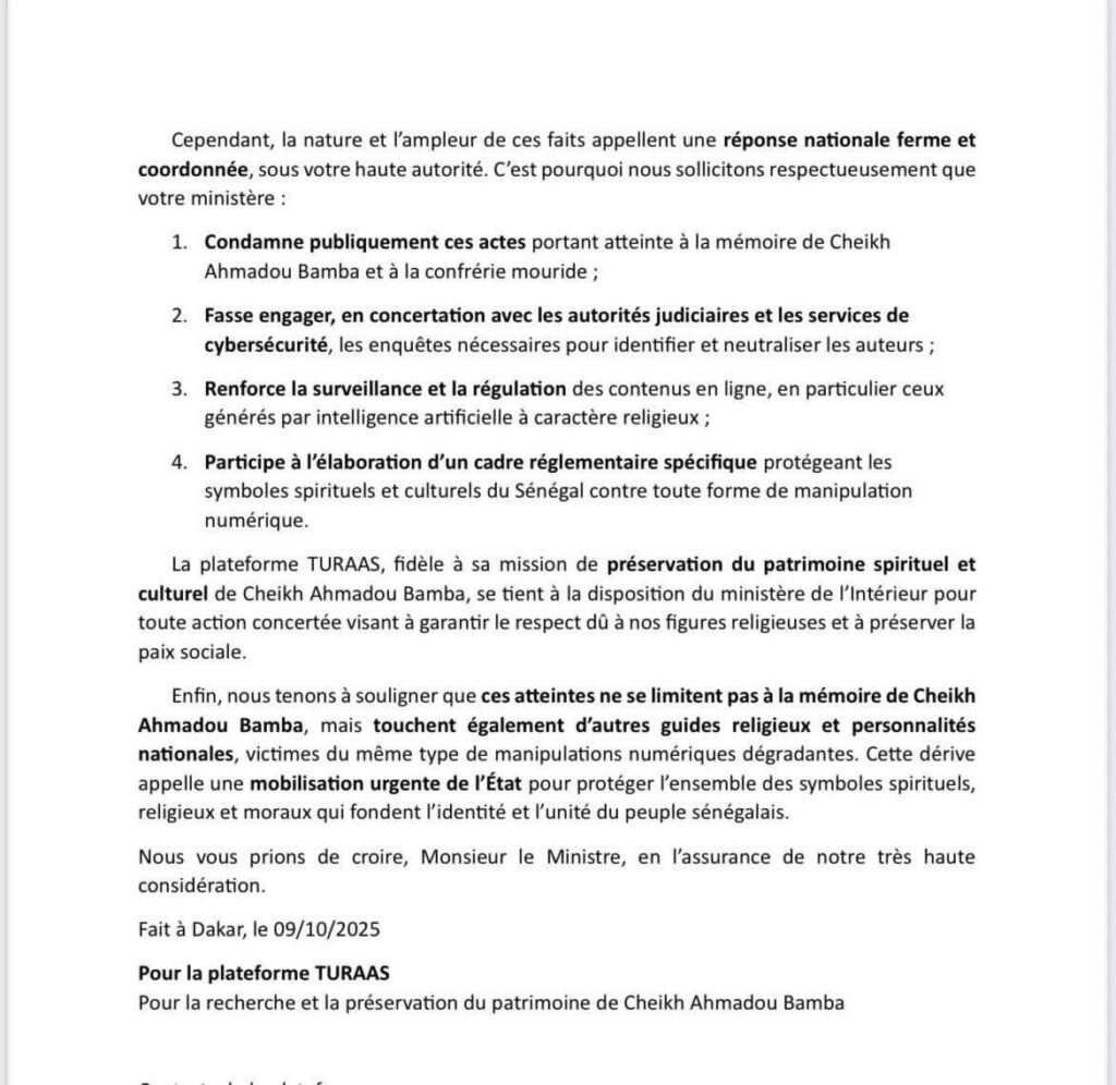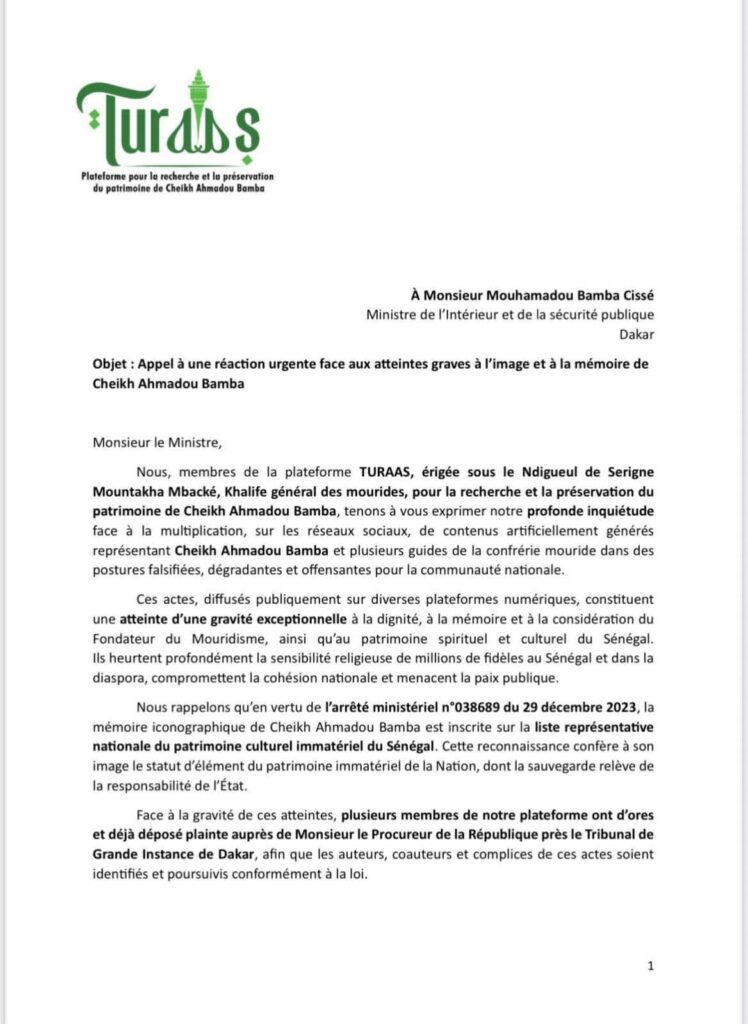 La plateforme Turaas a alerté l’opinion publique nationale et internationale sur la persistance de contenus dégradants visant l’image de Cheikh Ahmadou Bamba et des guides spirituels sénégalais sur les réseaux sociaux, a appris Seneweb du docteur Serigne Khadim Ngom, responsable moral de l’organisation. Et devant la multiplication des vidéos et d’images offensantes diffusées en ligne, Turaas a engagé plusieurs actions, dont une correspondance officielle au ministre de l’Intérieur pour solliciter une réponse ferme de l’État, et une plainte a été déposée auprès du procureur de la République, pour identifier et poursuivre les auteurs de ces contenus.La plateforme a également lancé une campagne de signalement des comptes TikTok diffusant ces publications jugées attentatoires à la dignité des figures religieuses du Sénégal.Turaas, dont la mission est la préservation du patrimoine spirituel et culturel de Cheikh Ahmadou Bamba, affirme sa détermination à poursuivre ses actions de protection de l’image du fondateur du mouridisme et de l’ensemble des guides religieux du pays.