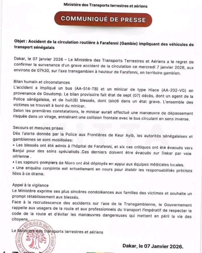 PolitiqueSociété Accident à Farafenni: Le ministère des Transports fait le point ! janvier 8, 2026 Faye