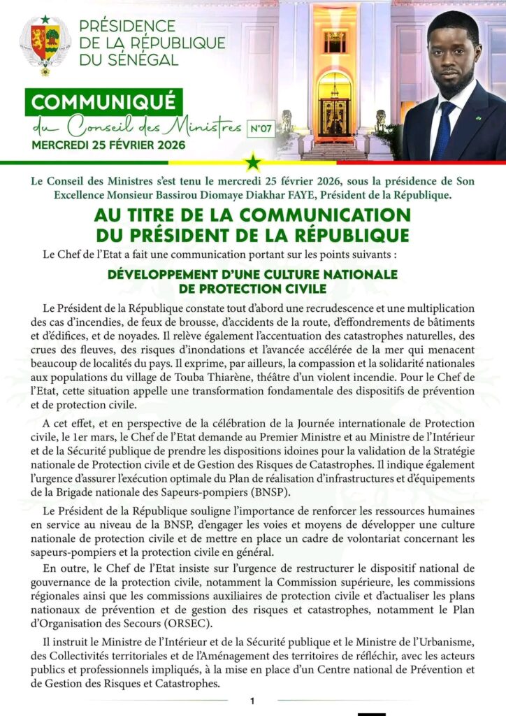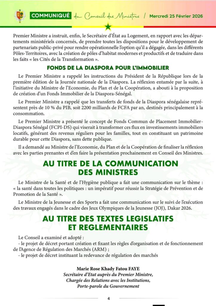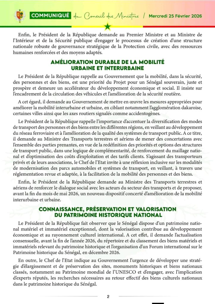 Communiqué du Conseil des ministres de ce mercredi 25 février 2026