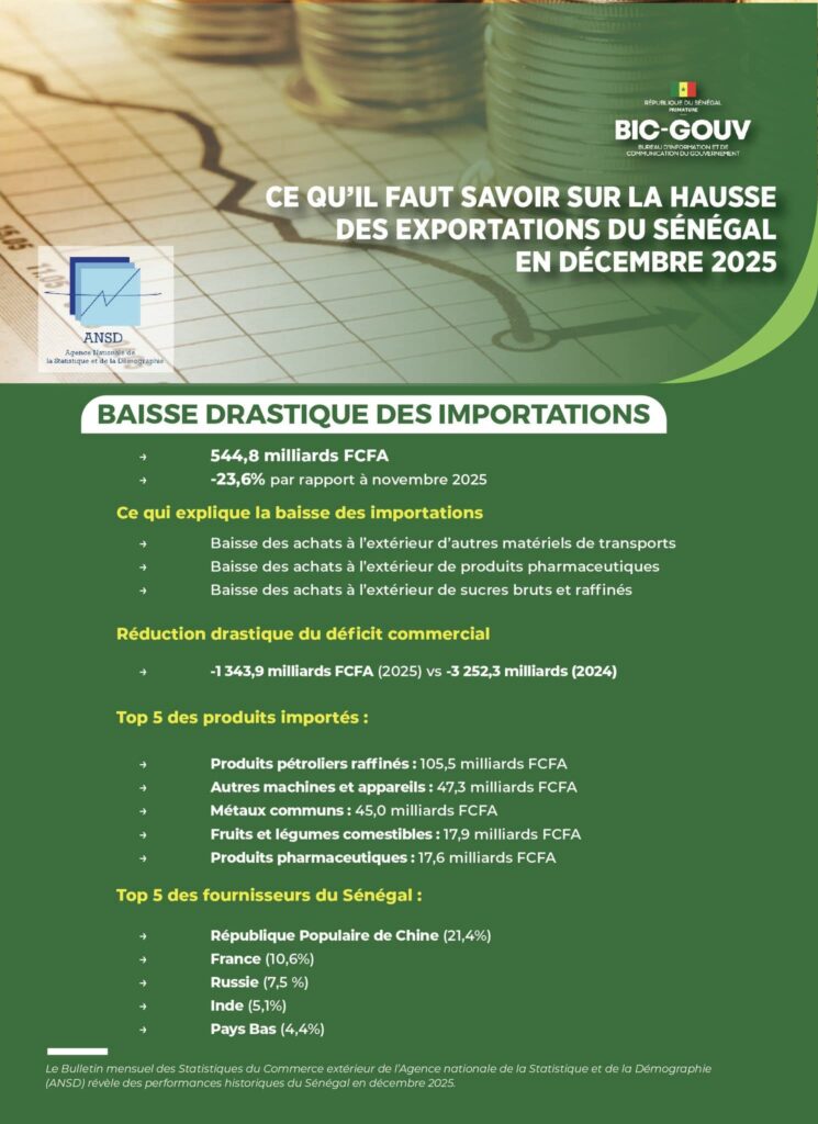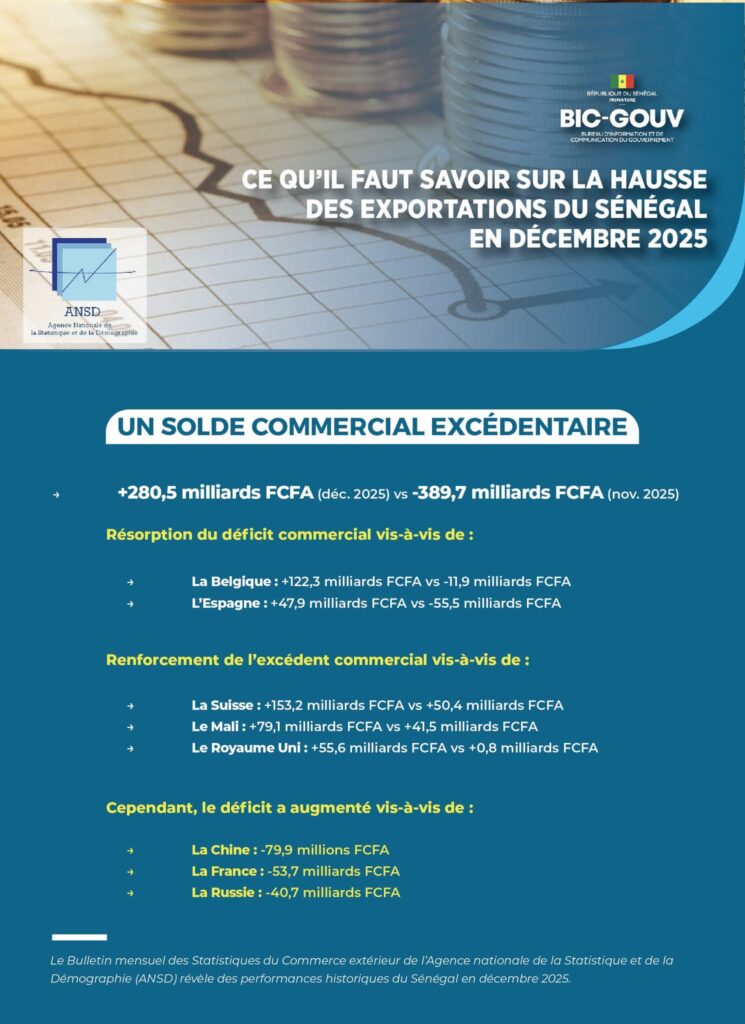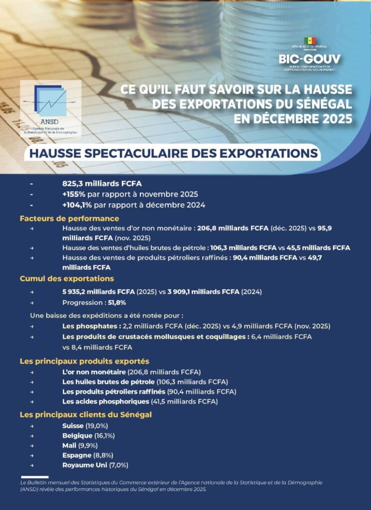 Selon l’Agence Nationale de la Statistique et de la Démographie – ANSD, les exportations du Sénégal ont fortement augmenté en décembre 2025 pour atteindre 825,3 milliards FCFA, soit +155% par rapport au mois précédent.