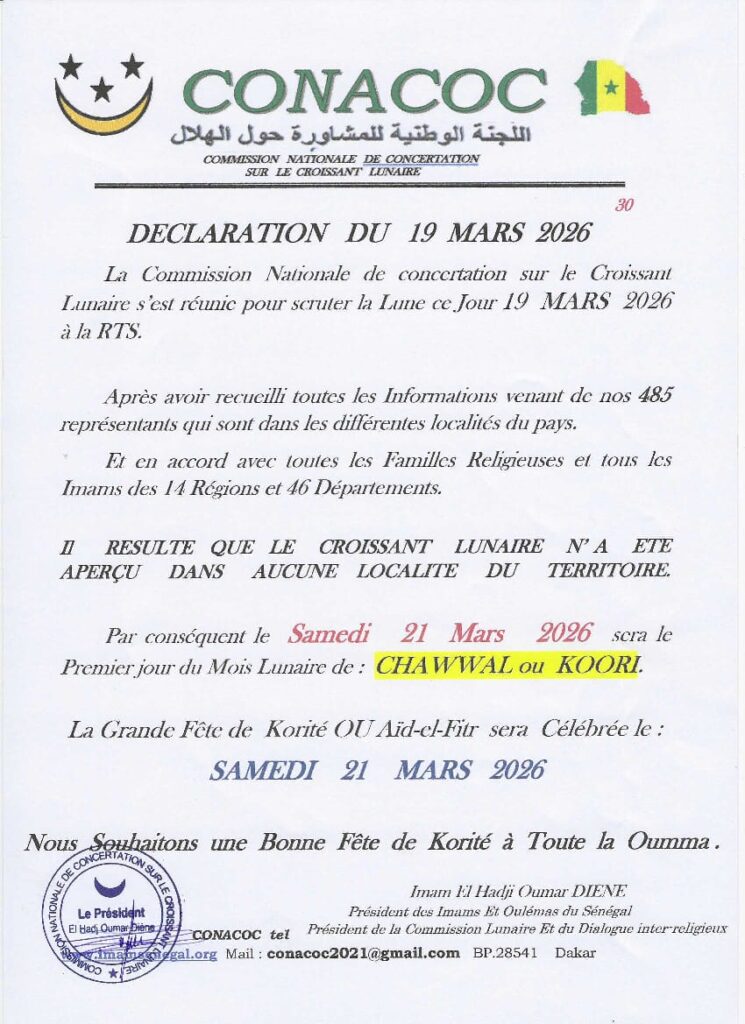 Selon la commission, les informations recueillies auprès de leur 485 représentants confirment que la lune n’a pas été aperçue au Sénégal aujourd’hui.