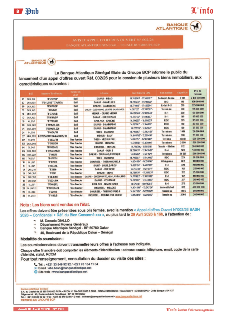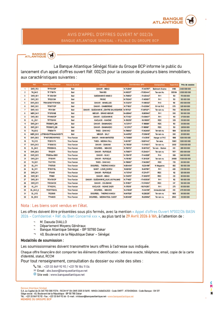 La Banque Atlantique Sénégal filiale du Groupe BCP informe le public du lancement d’un appel d’offres ouvert Réf. 002/26 pour la cession de plusieurs biens immobiliers, aux caractéristiques suivantes :