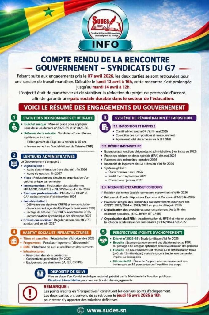 Le gouvernement et les syndicats du G7 ont franchi un pas important vers la stabilisation du secteur éducatif en signant un protocole d’accord, à l’issue de négociations intensives tenues du 13 au 14 avril 2026. Cet accord s’inscrit dans le cadre du suivi des engagements pris le 7 avril et vise à instaurer une paix sociale durable dans l’éducation.