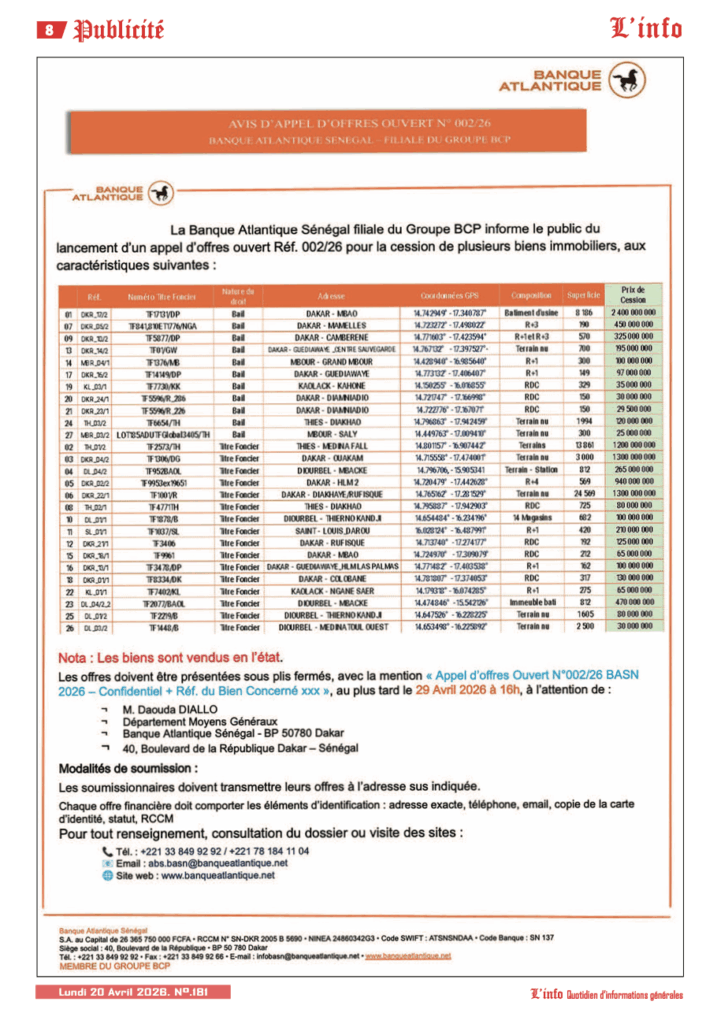 Economie Cession immobilière : Banque Atlantique Sénégal lance un appel d’offres ouvert Réf. 002/26 avril 20, 2026 Ibrahima Lo