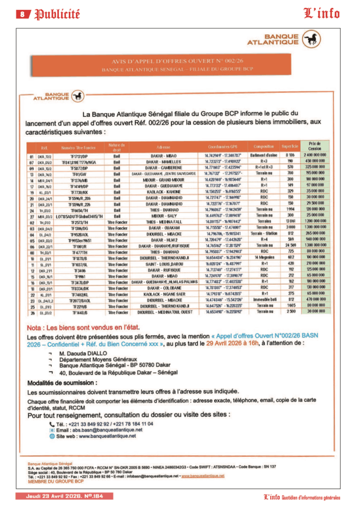 Economie Banque Atlantique Sénégal : lancement d’un appel d’offres ouvert Réf. 002/26 pour la cession de biens immobiliers avril 23, 2026 Ibrahima Lo La Banque Atlantique Sénégal filiale du Groupe BCP informe le public du lancement d’un appel d’offres ouvert Réf. 002/26 pour la cession de plusieurs biens immobiliers, aux caractéristiques suivantes :