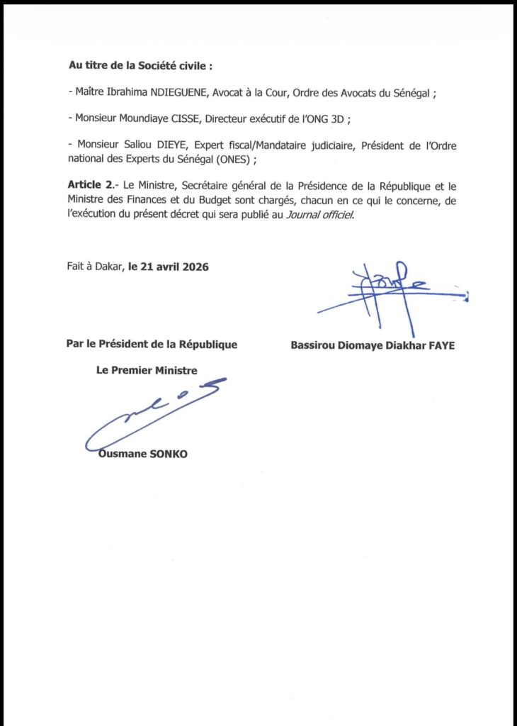 Par ailleurs, le ministre, secrétaire général de la présidence de la République et ministre des Finances et du Budget sont chargés, chacun en ce qui le concerne, de l’exécution du présent décret qui sera publié au Journal officiel.