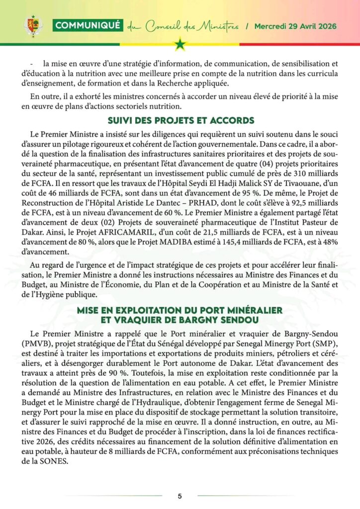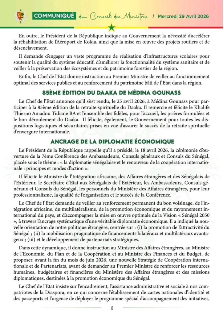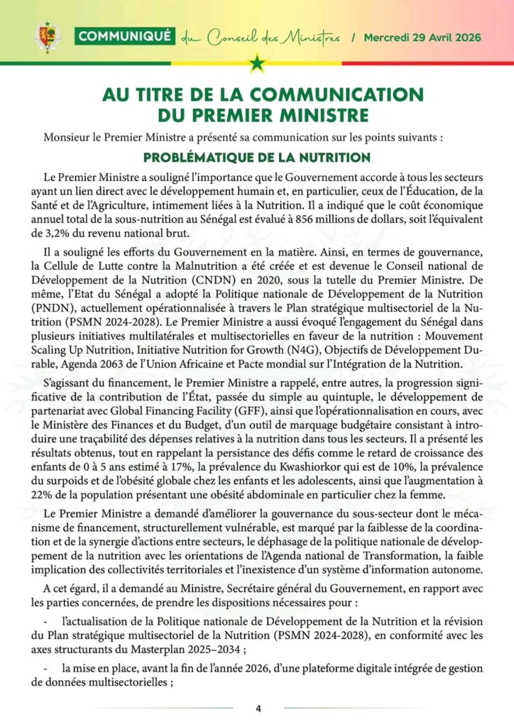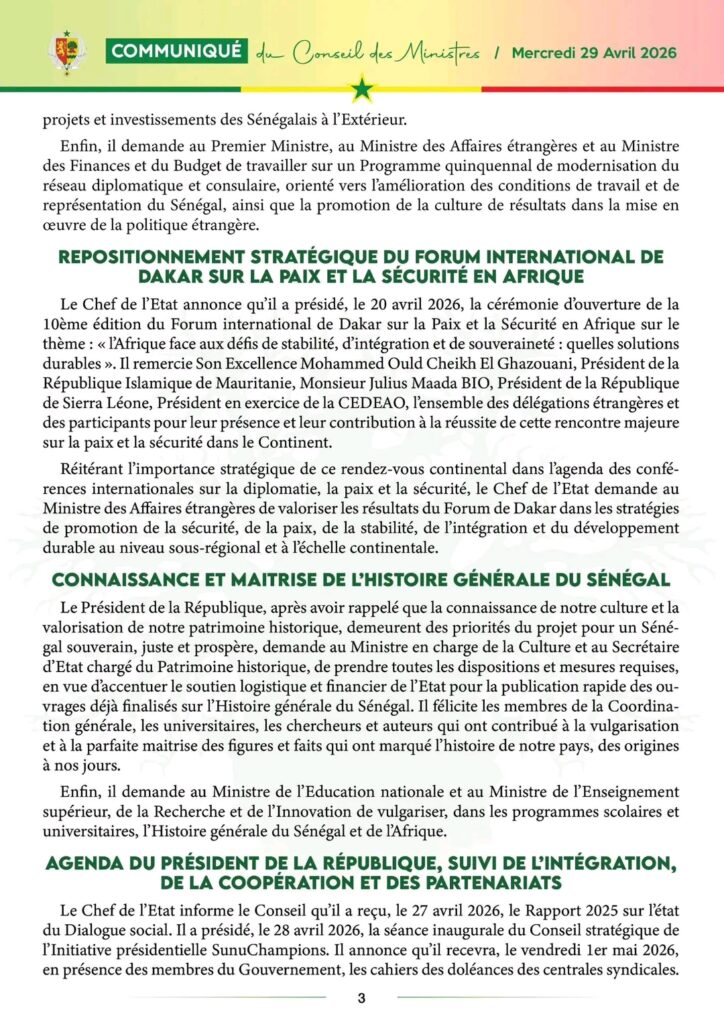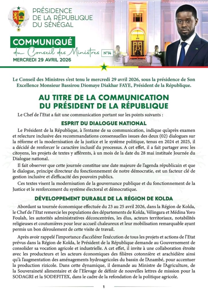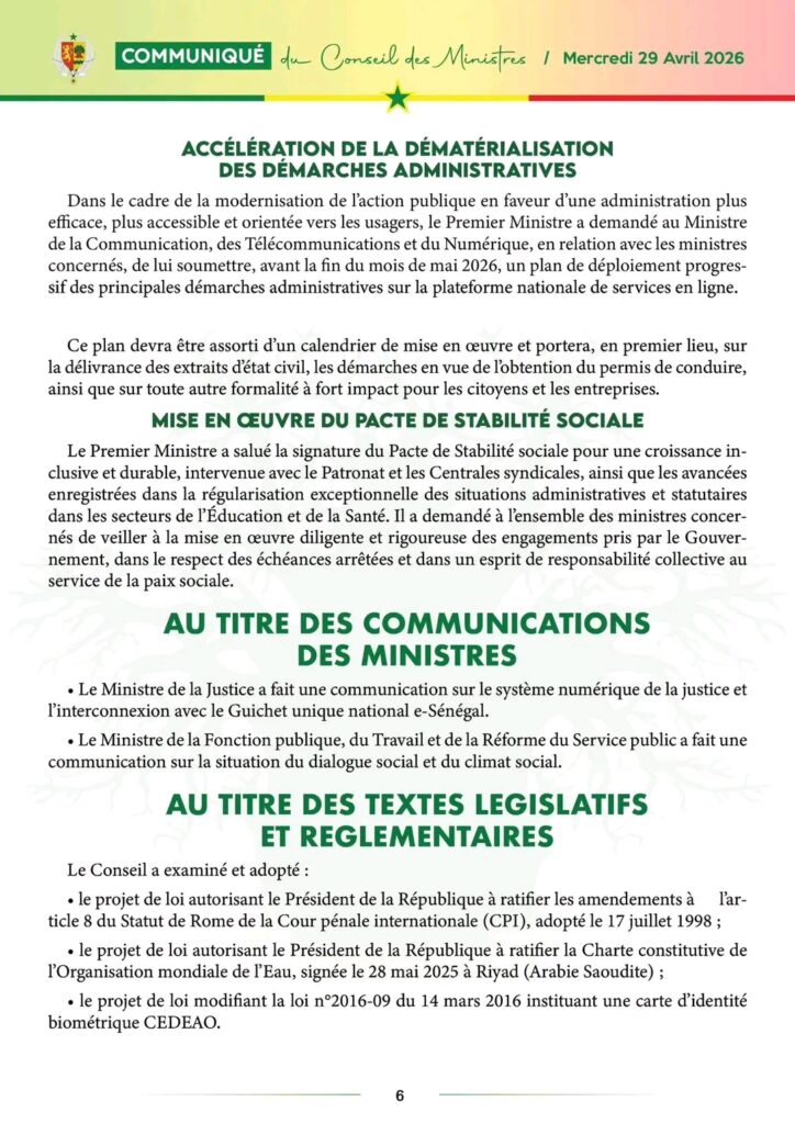 Communiqué du Conseil des ministres de ce mercredi 29 avril 2026